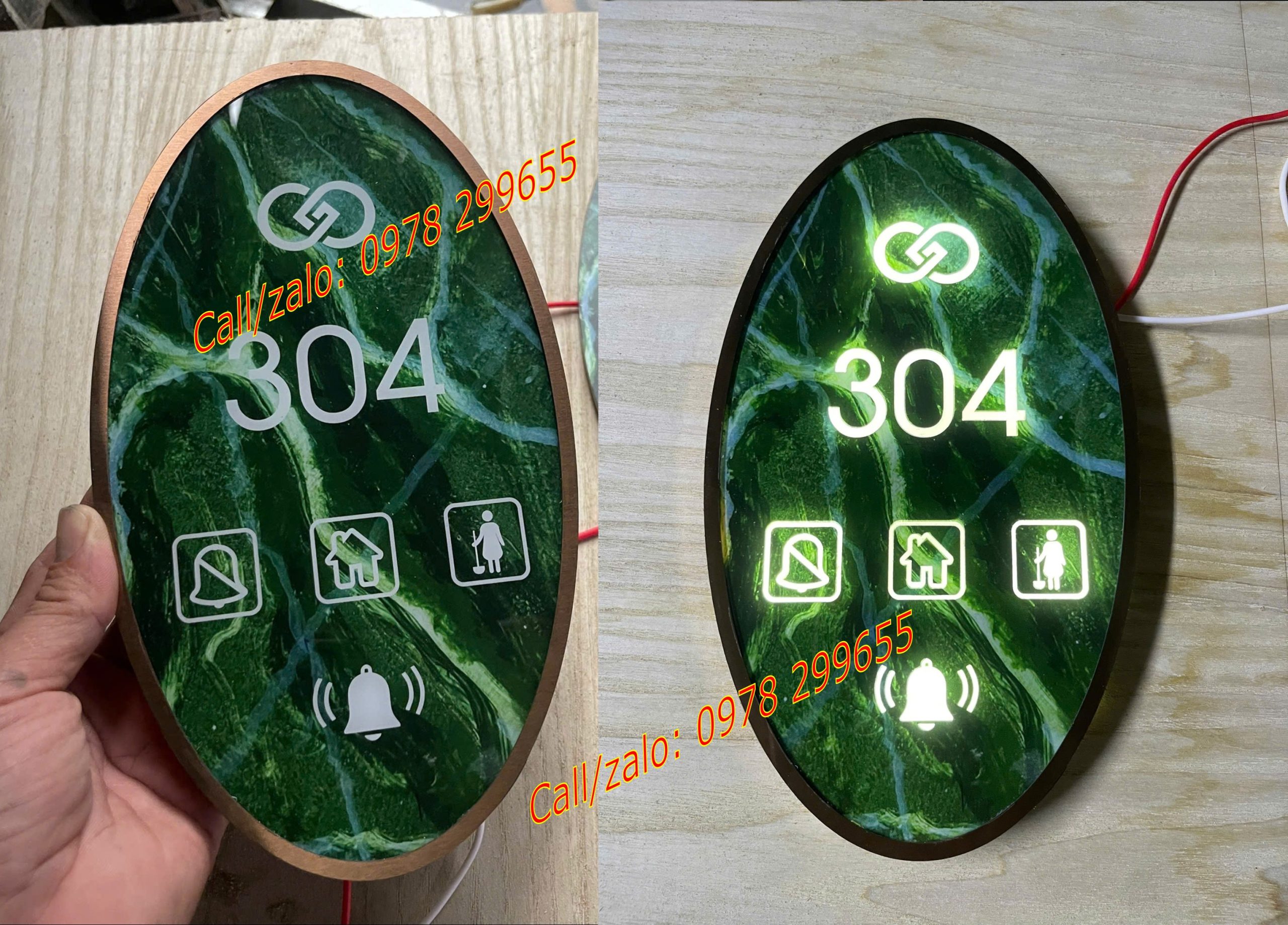 Biển là sản phẩm được sử dụng nhiều hiện nay, vừa thông báo số phòng tích hợp chuông cảm ứng nhấn. Lại thêm phần trang trí không gian hành lang thêm rực rỡ nhé.